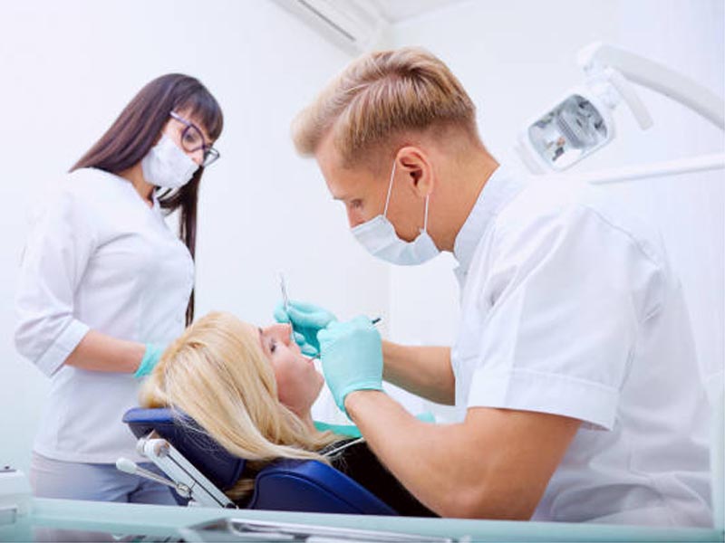 Dentist man with assistant treats teeth patient in hospital office